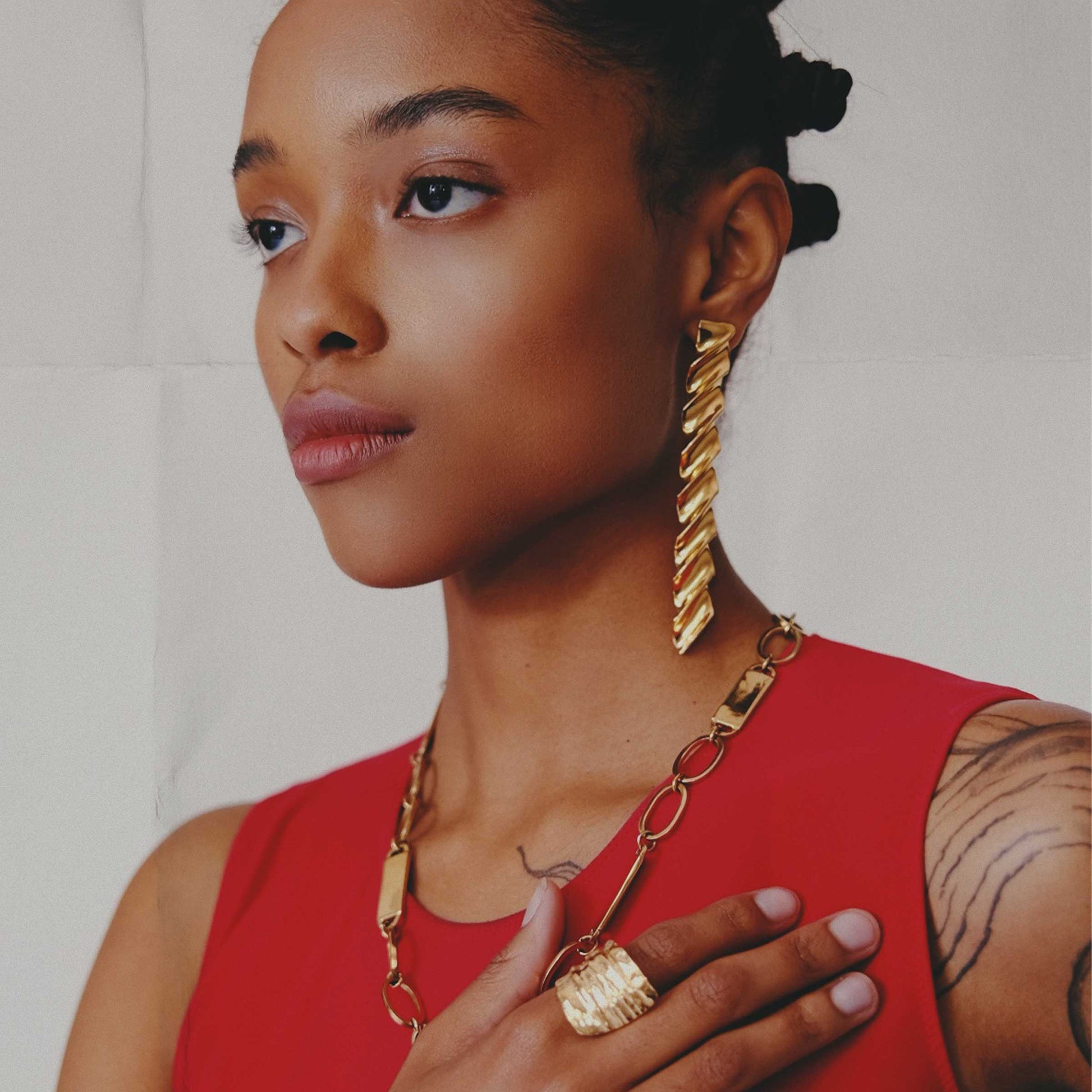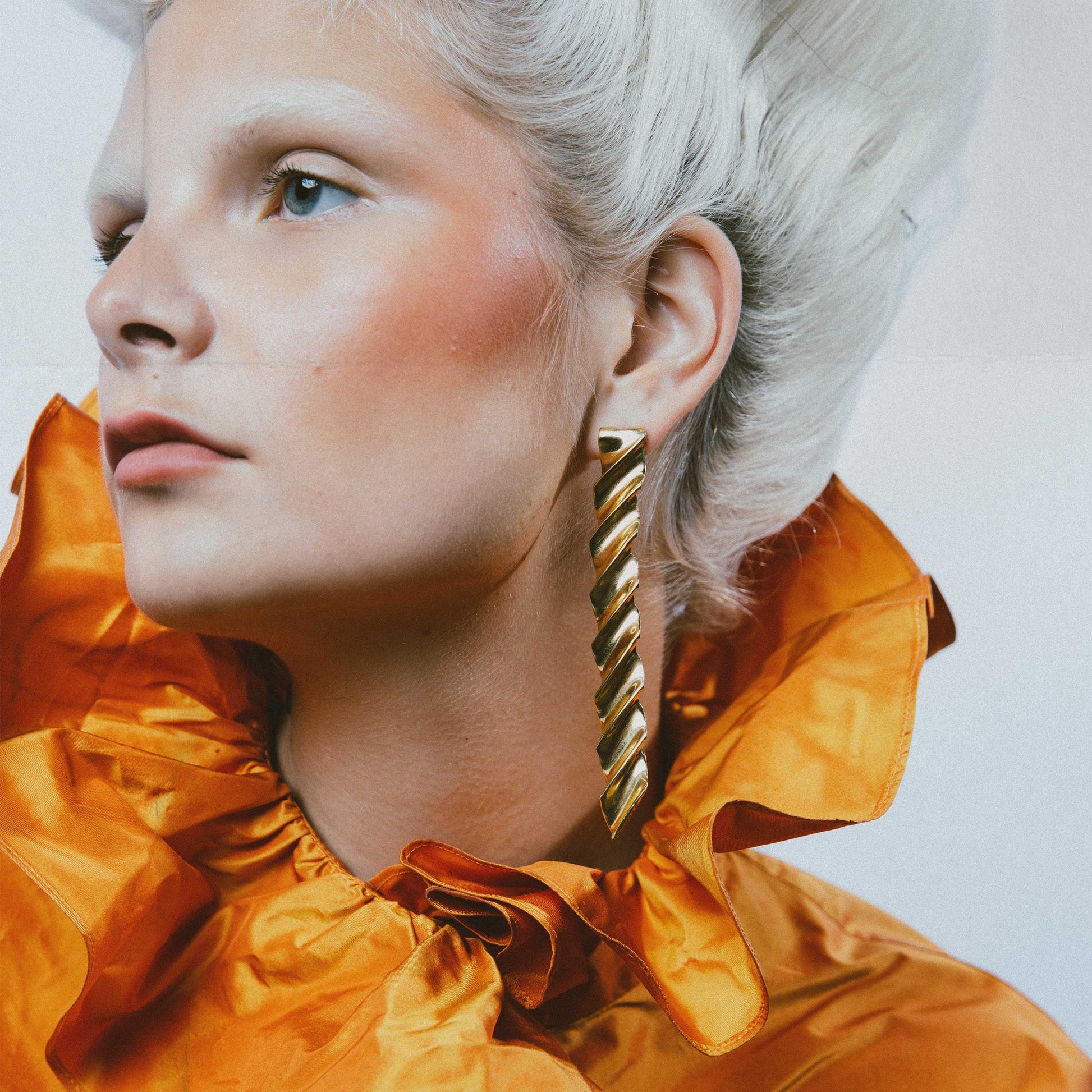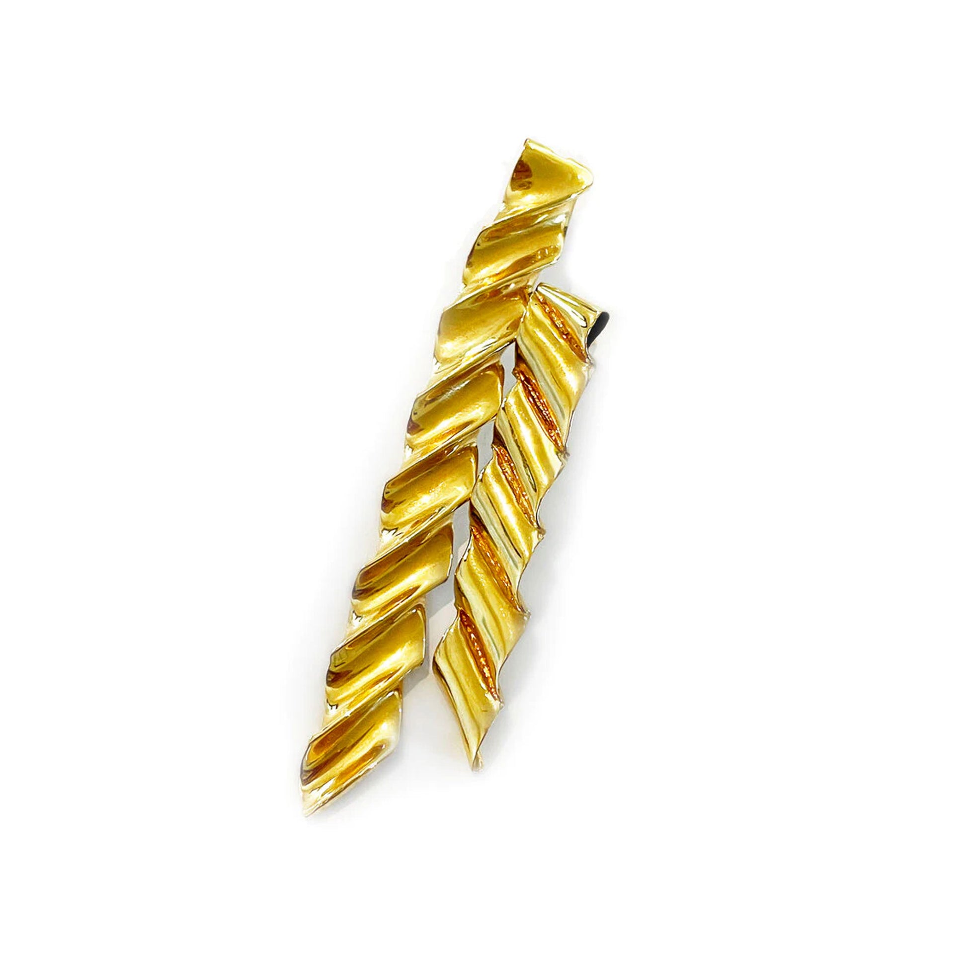 Pair of mismatched, sculptural earring in 14 gold vermeil made using fold form technique.