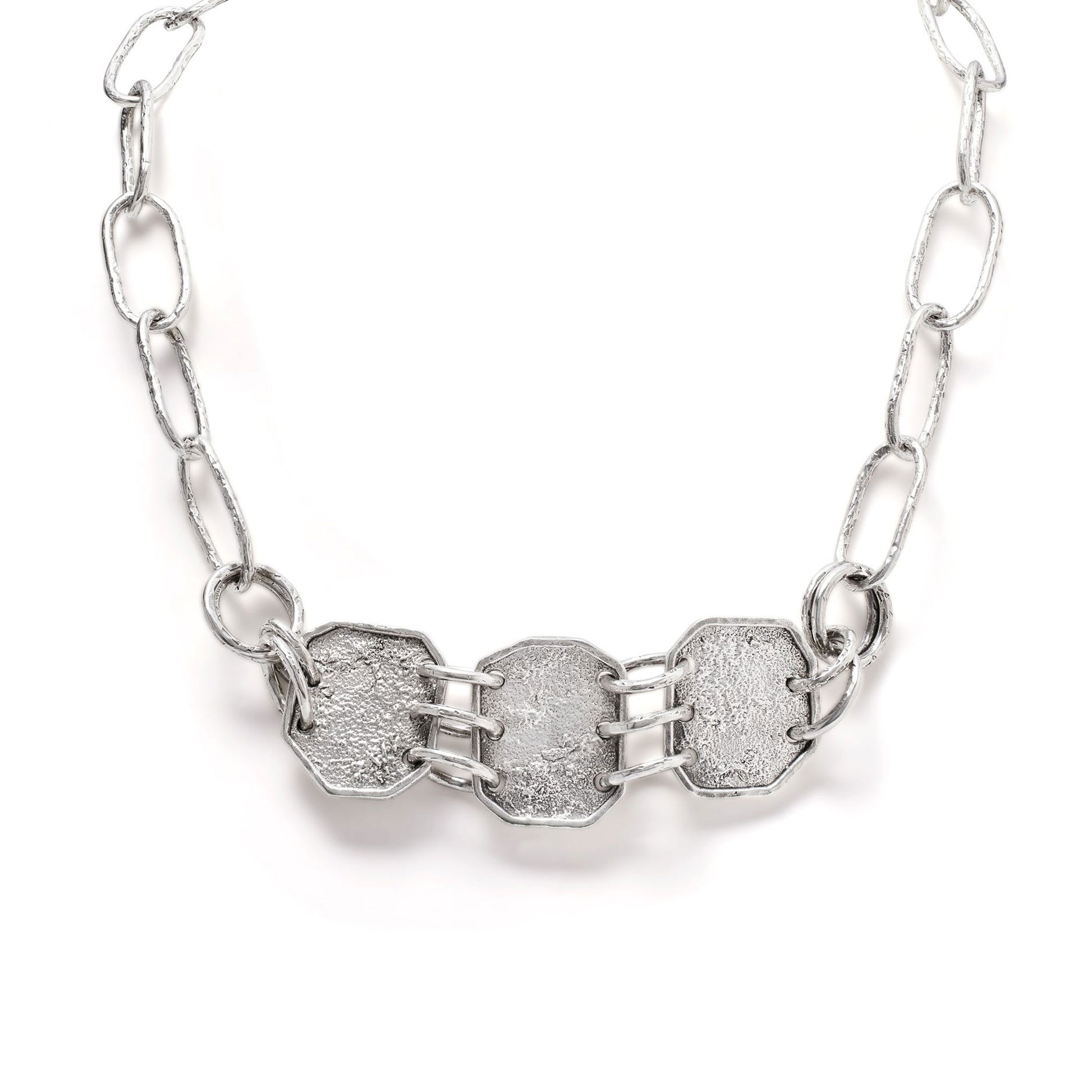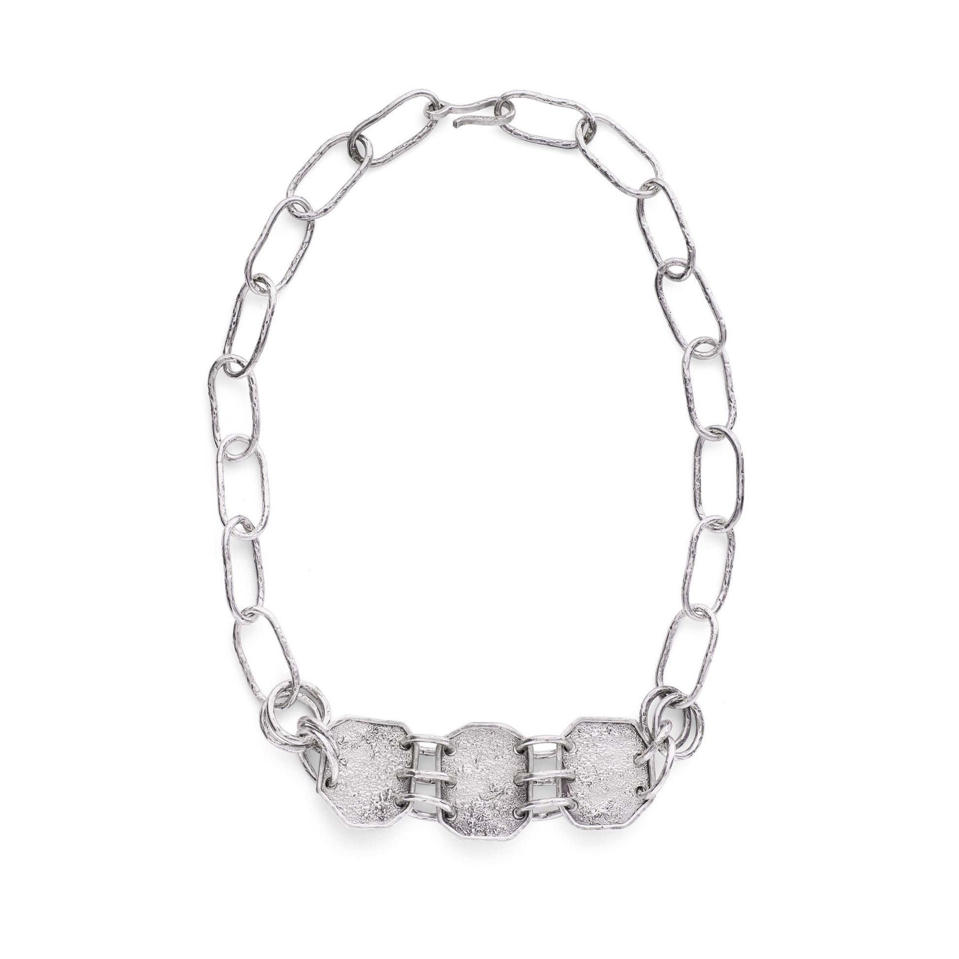 Handmade Sterling Silver inspired by the punk fashion era with patina necklace showcasing an oval chain with geometric shapes connected by circular rings.