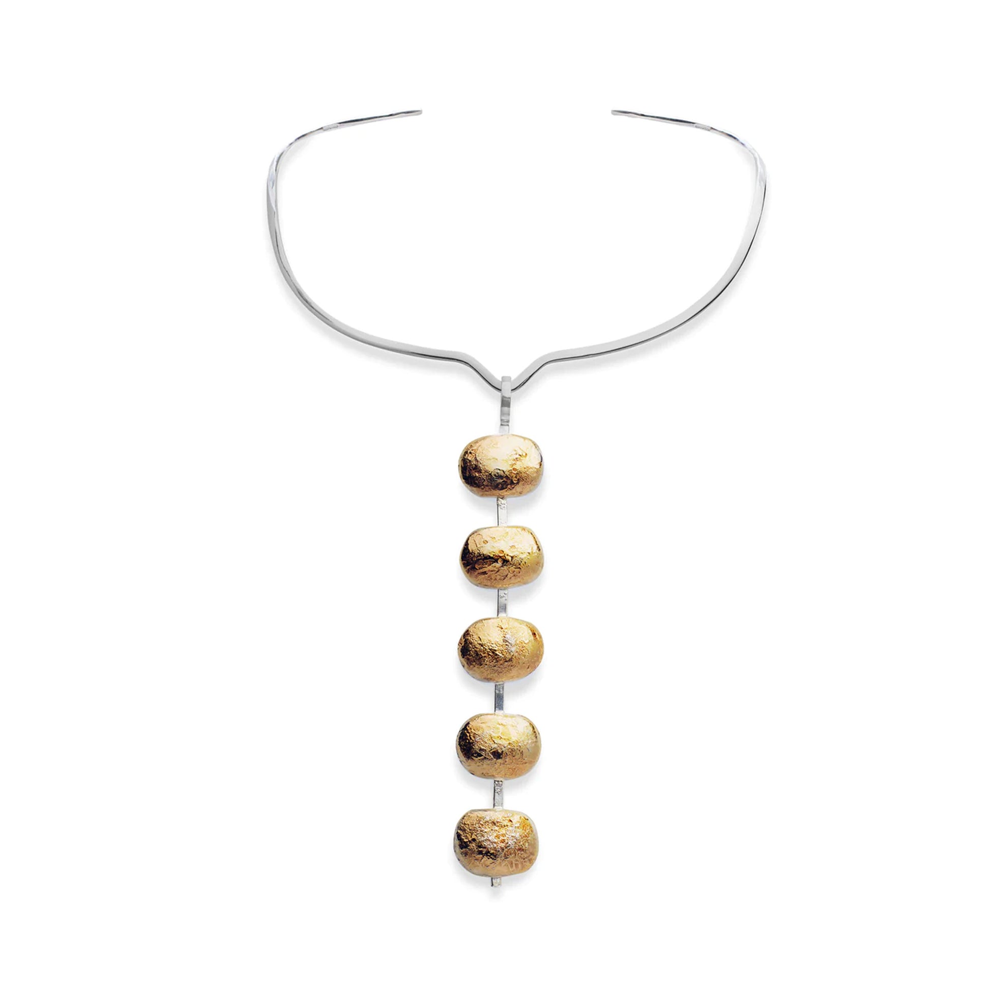 This necklace, inspired by Brutalist architecture, has beautiful textural elements made mostly with 14k vermeil and mixed with sterling silver.