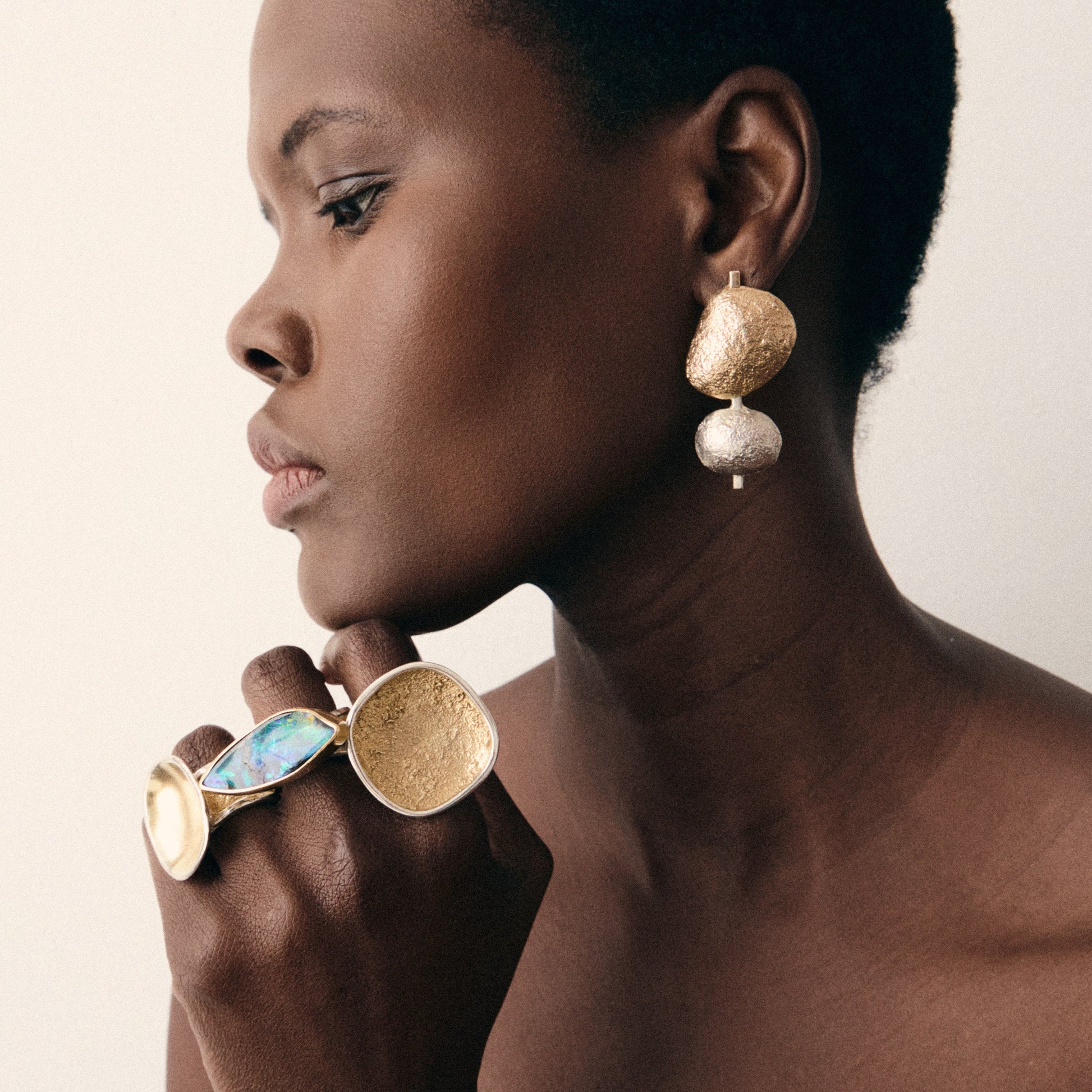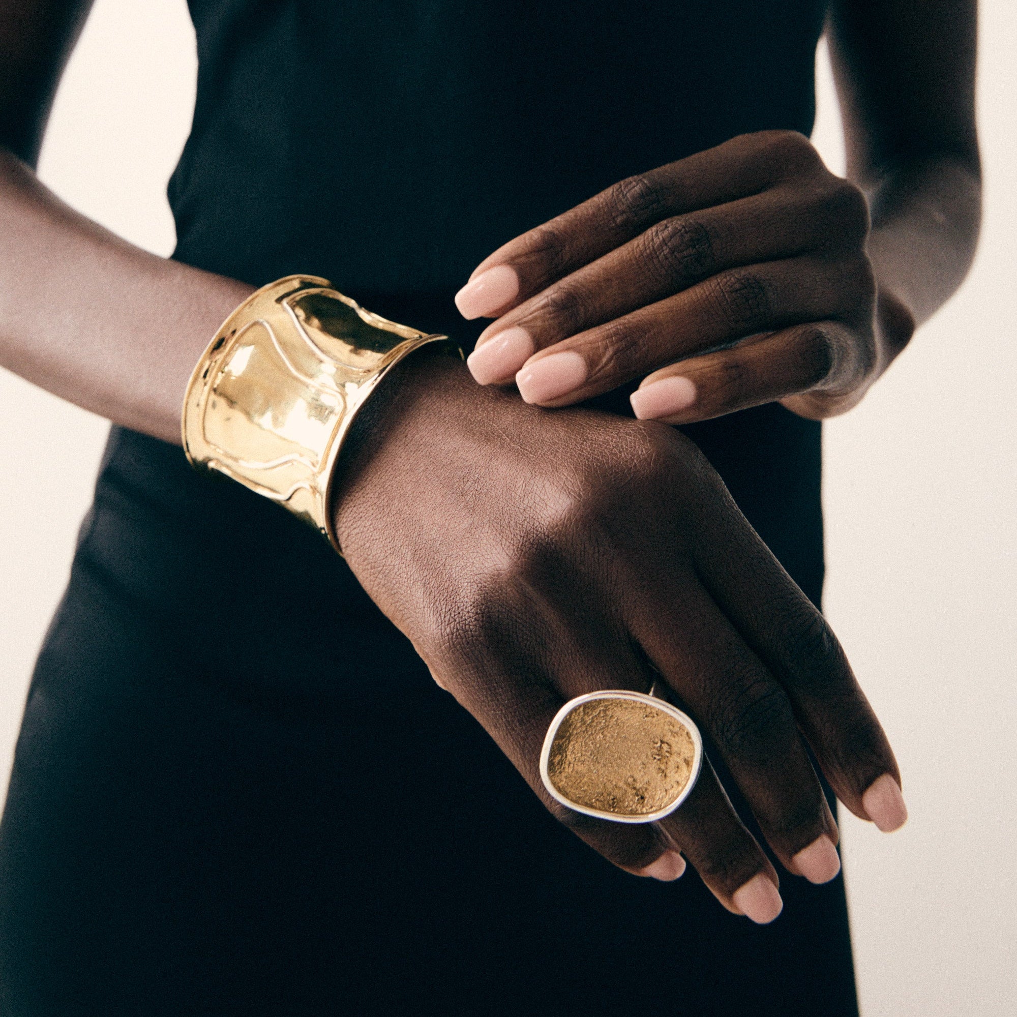 This bold and simple ring is inspired by the work of Brutalist architects and is a mix of 14k vermeil and sterling silver. The rough and smooth textures create a wonderful tension.