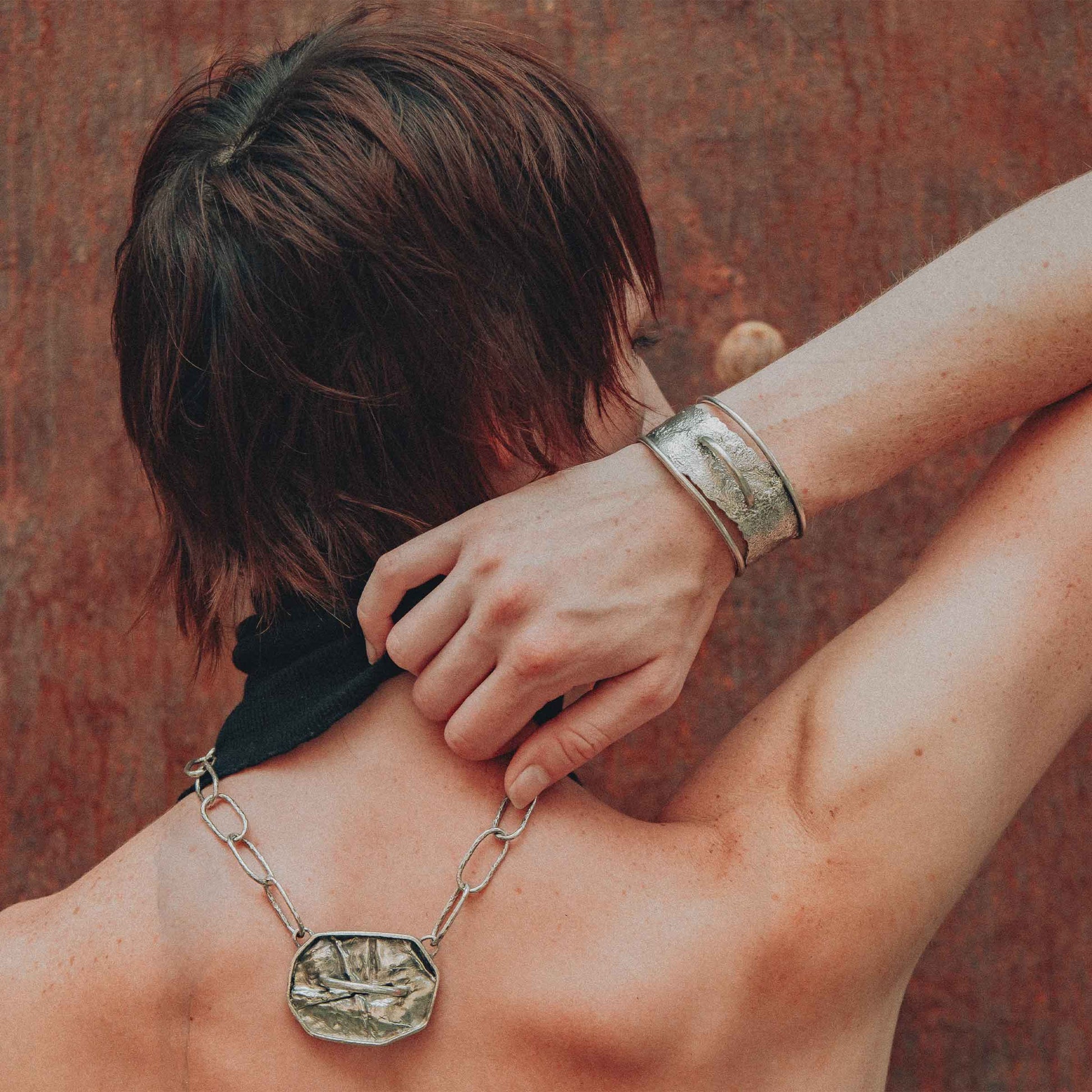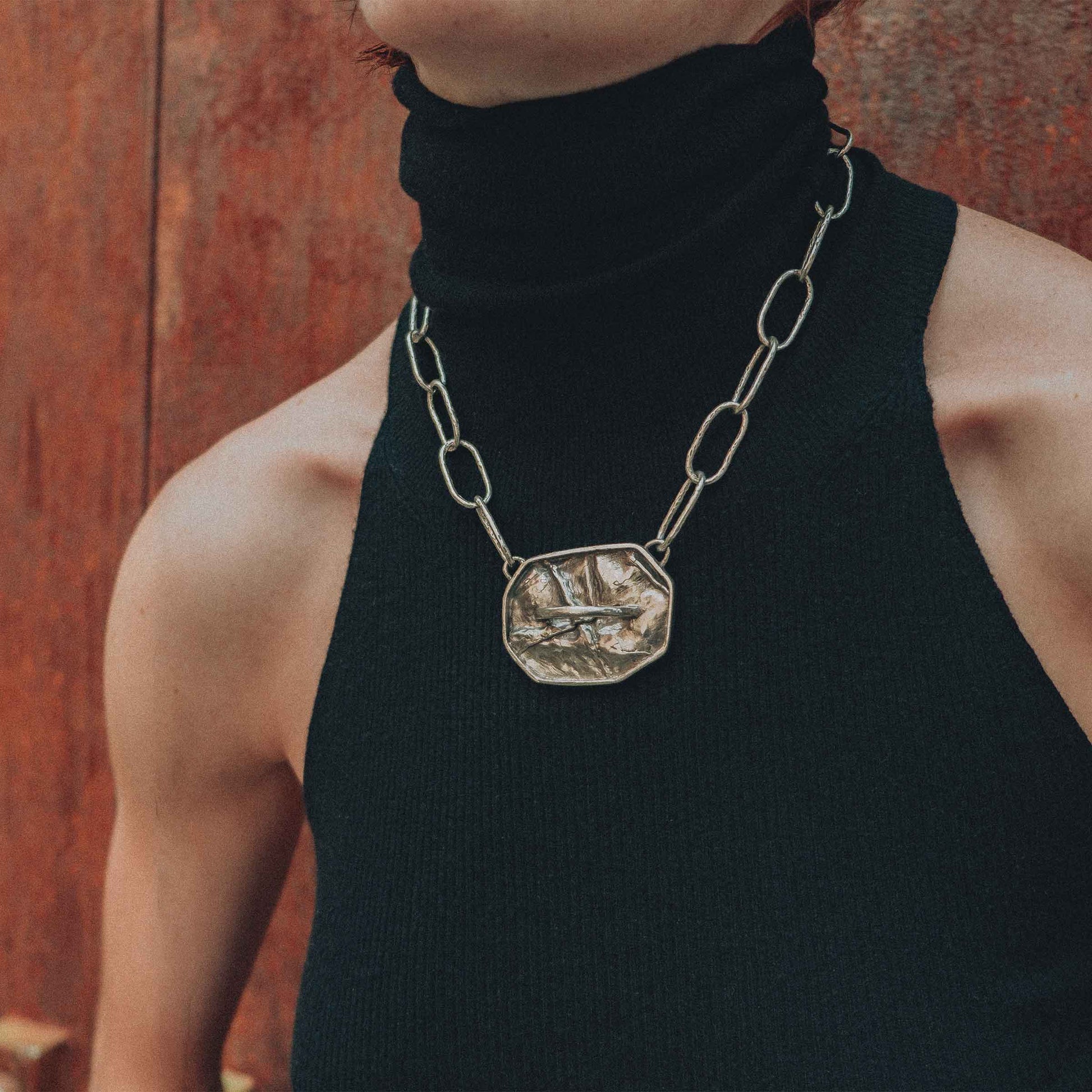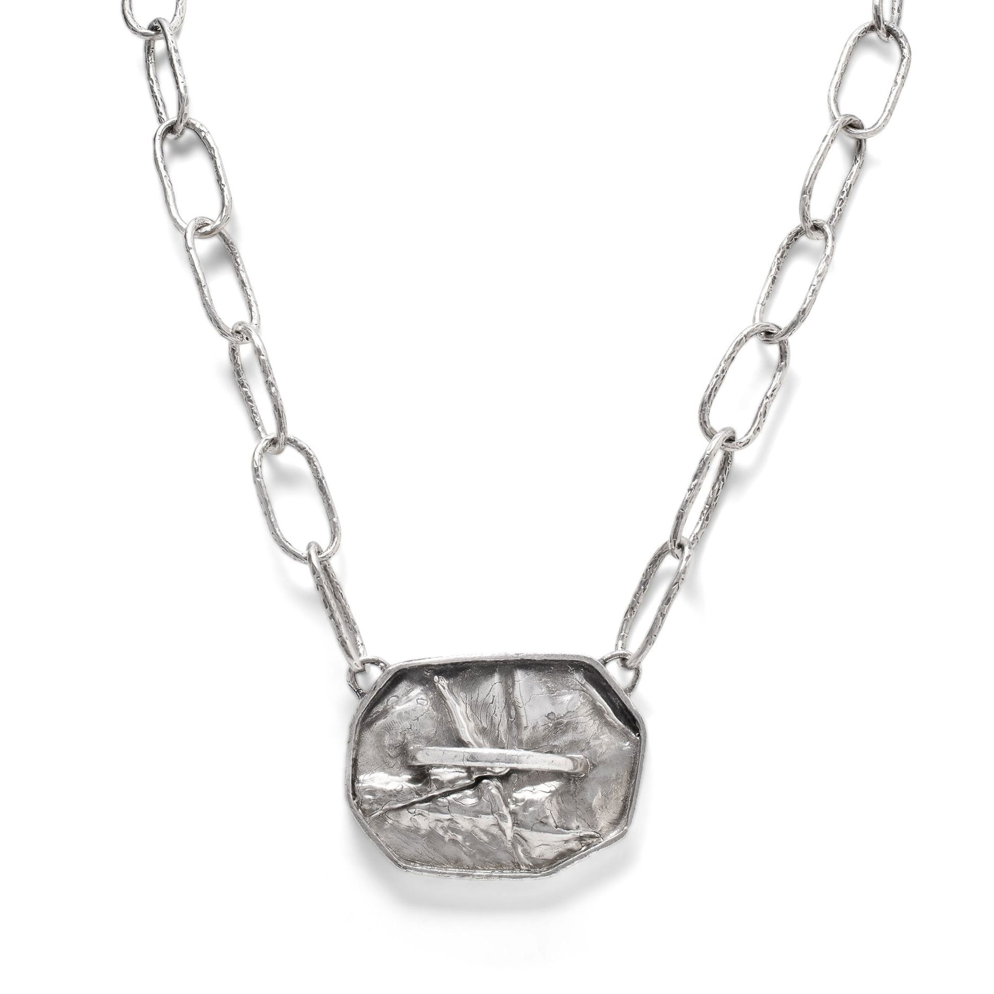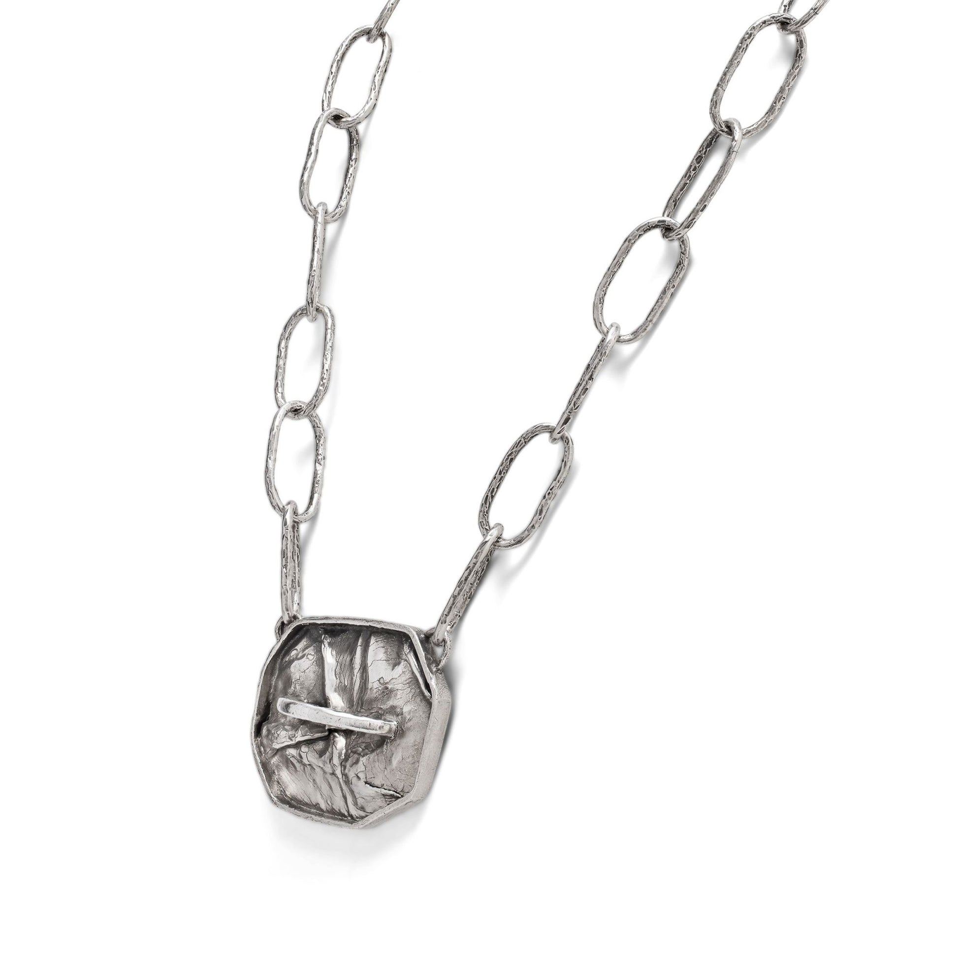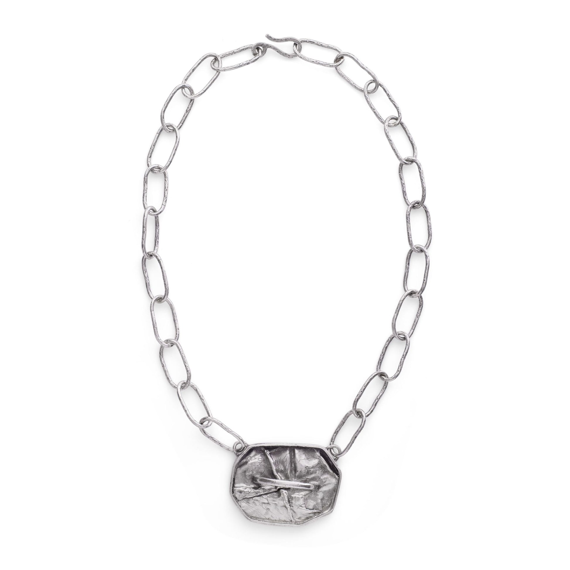 Handmade Sterling Silver pendant necklace with patina made with fold form technique featuring a link detail. This is punk inspired and has a raw, tough quality.