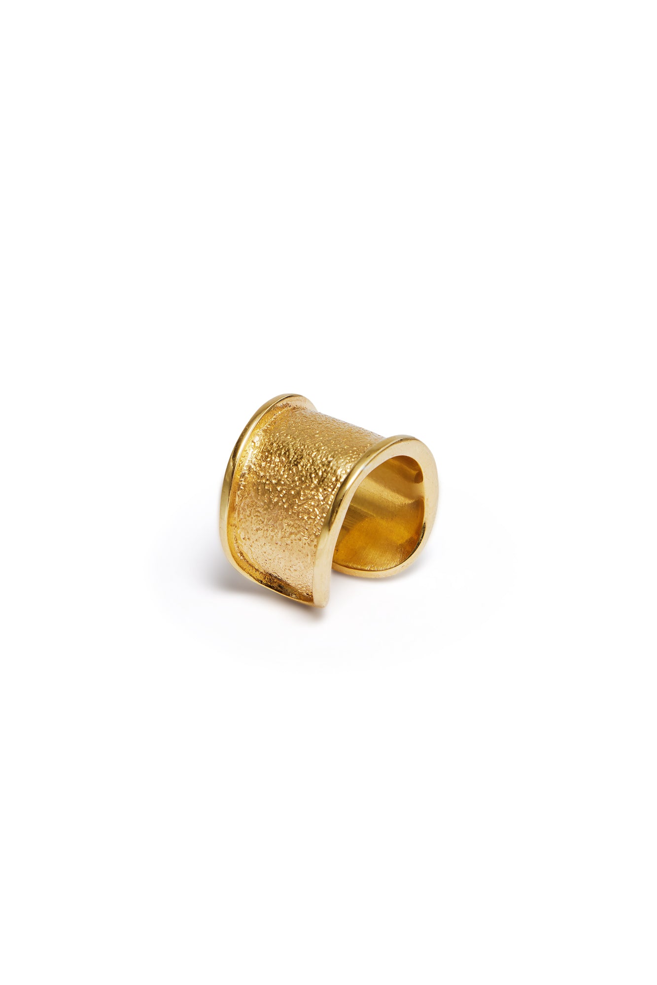 This ring has the shape of a traditional cigar band but with a granular texture and an open back so as to be worn two ways. Can be worn alone or paired with other rings.