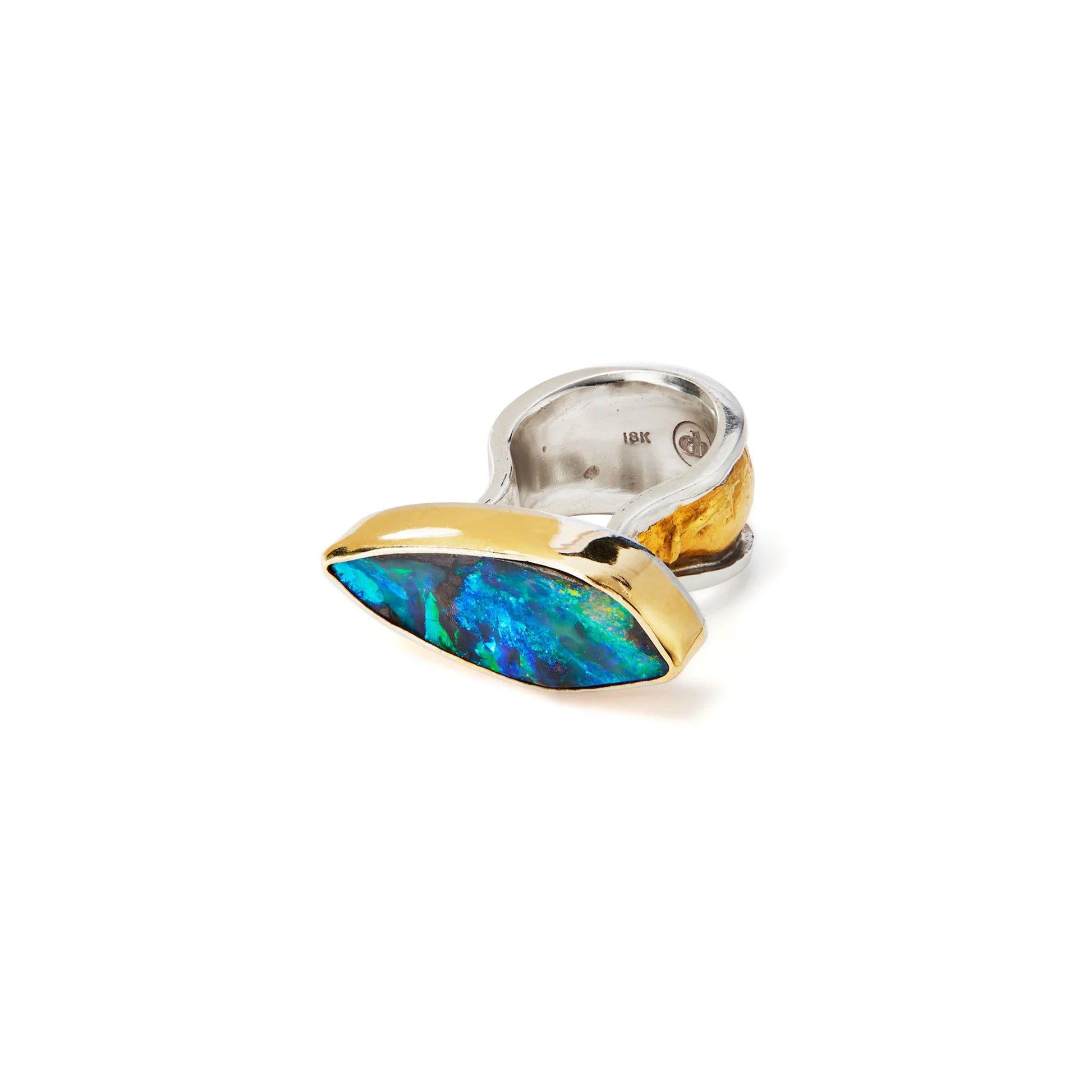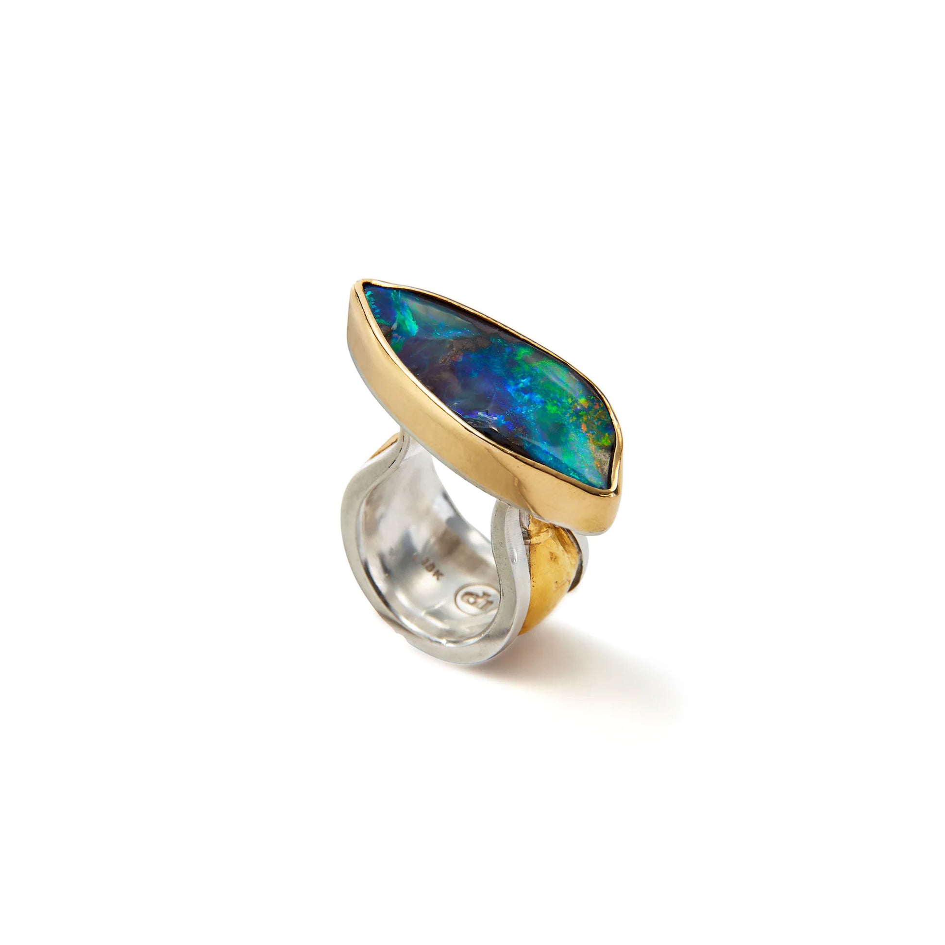This handmade, one of a kind ring features a stunning Australian fire opal set in a vermeil bezel and sterling band with 24K gold Korean keum-boo technique. Thin gold foil is placed on the object and a polished steel burnisher tacks it down and then presses it over the surface fixing it permanently in place. It is simply stunning.
