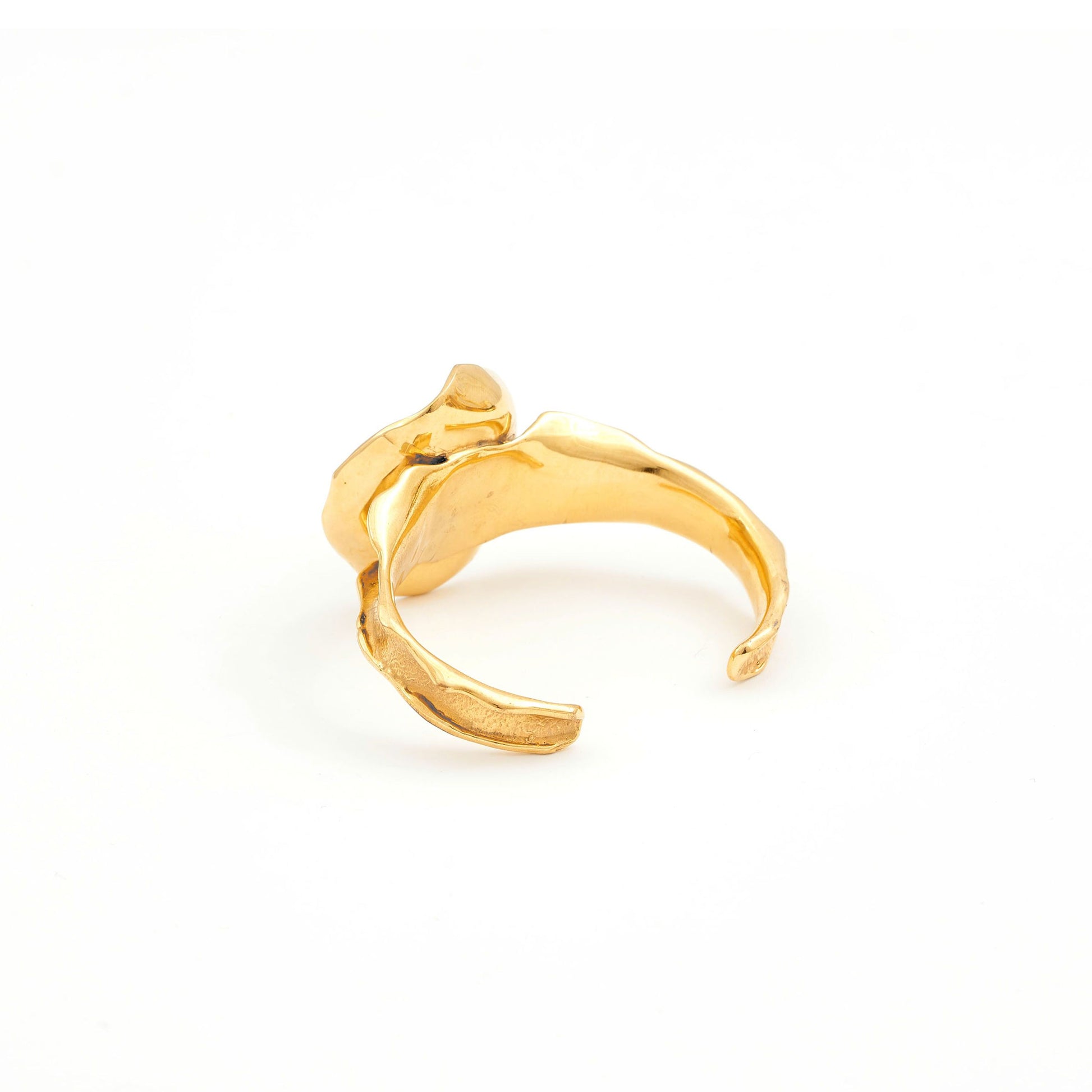 14 karat gold plated brass organic shaped cuff bracelet. This statement making sculptural design was inspired by forms in nature that are reminiscent of a flower and is made from a wax carving,