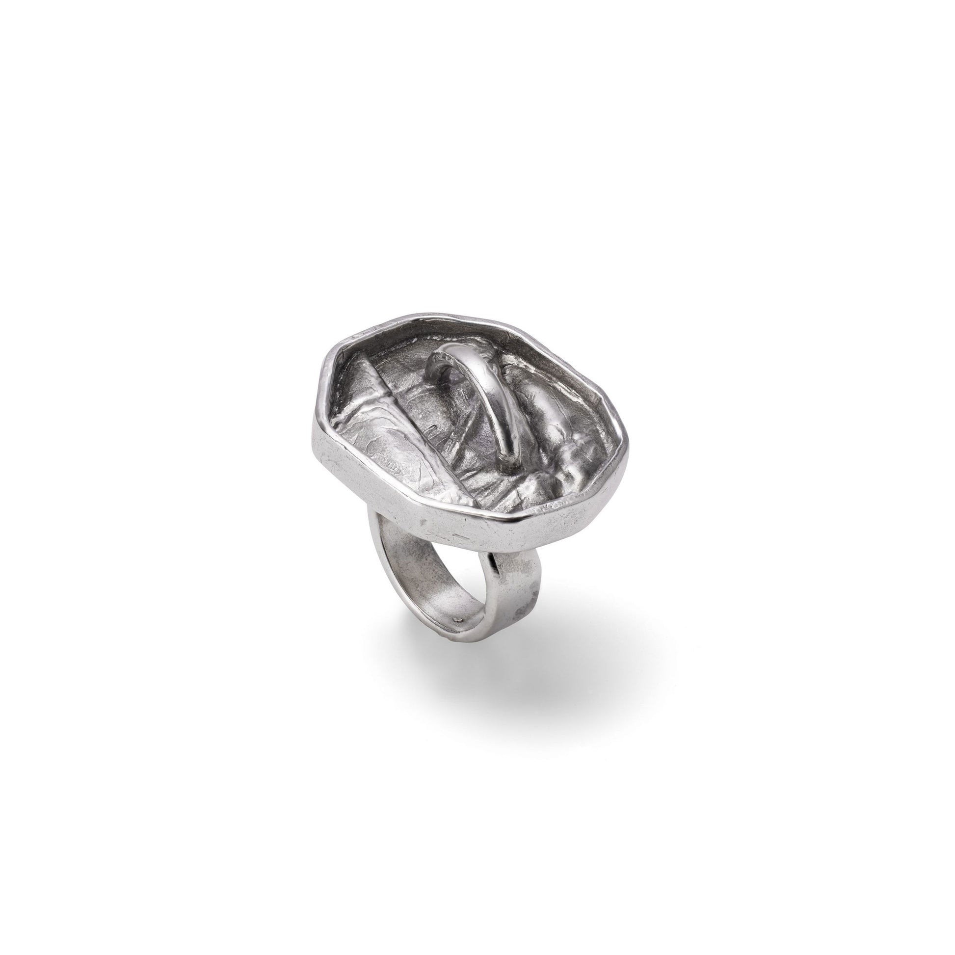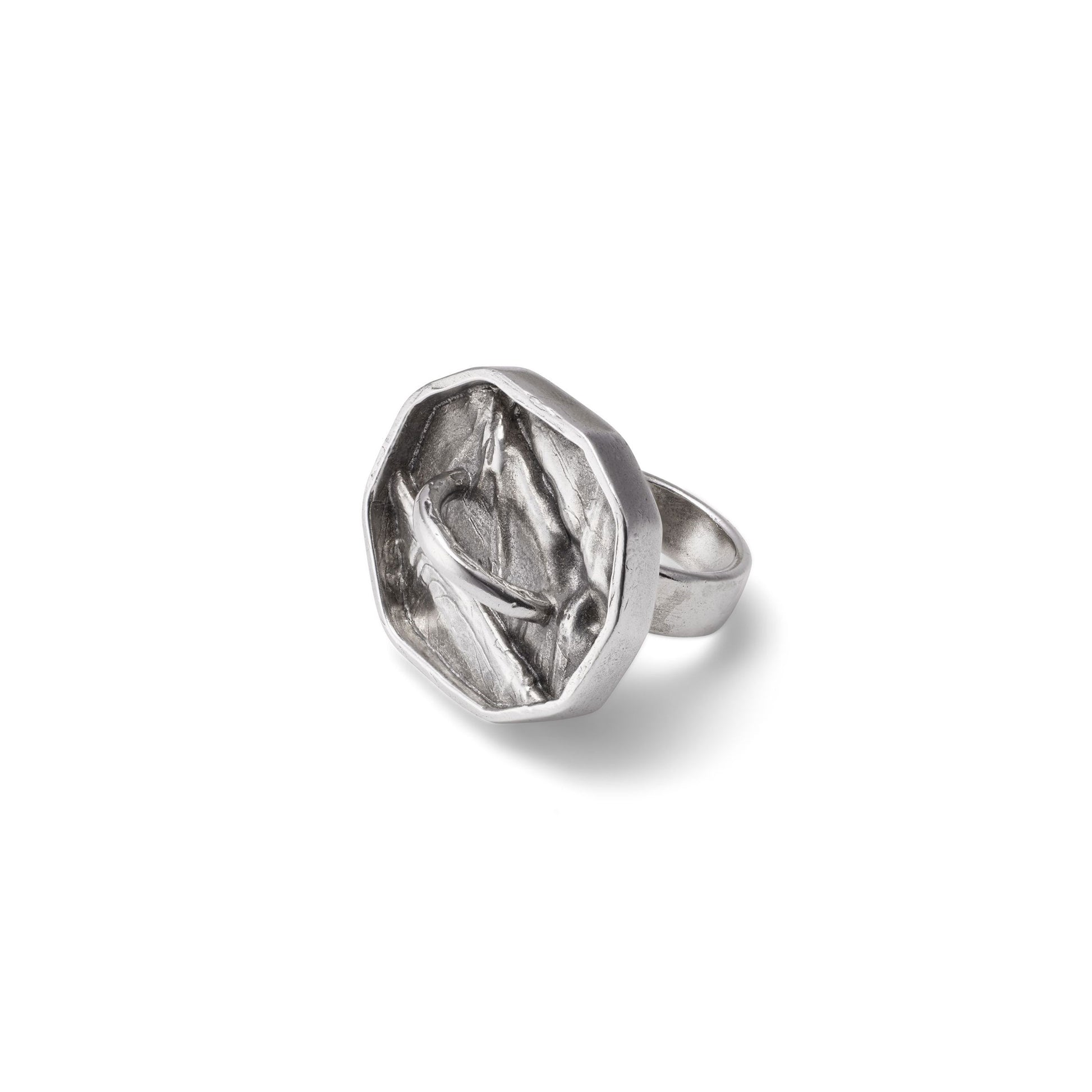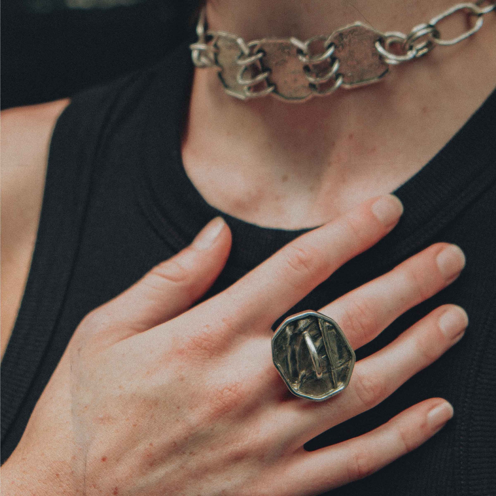 Handmade Sterling Silver with patina ring made with fold form technique with link detail is inspired by the punk aesthetic of the 70s. It is tough and bold.