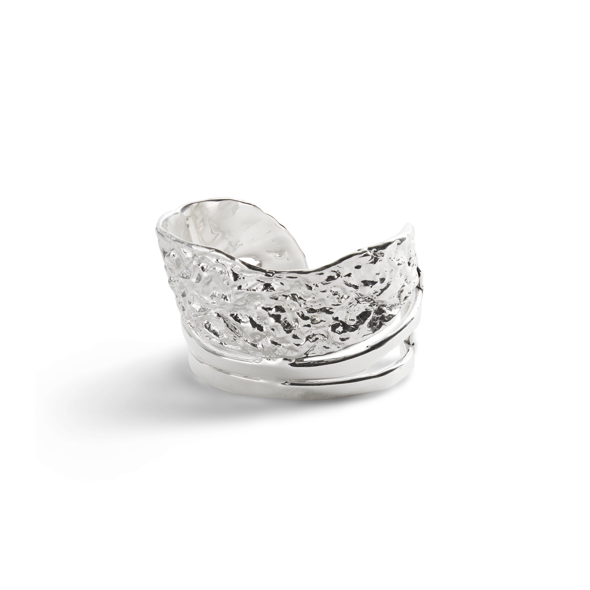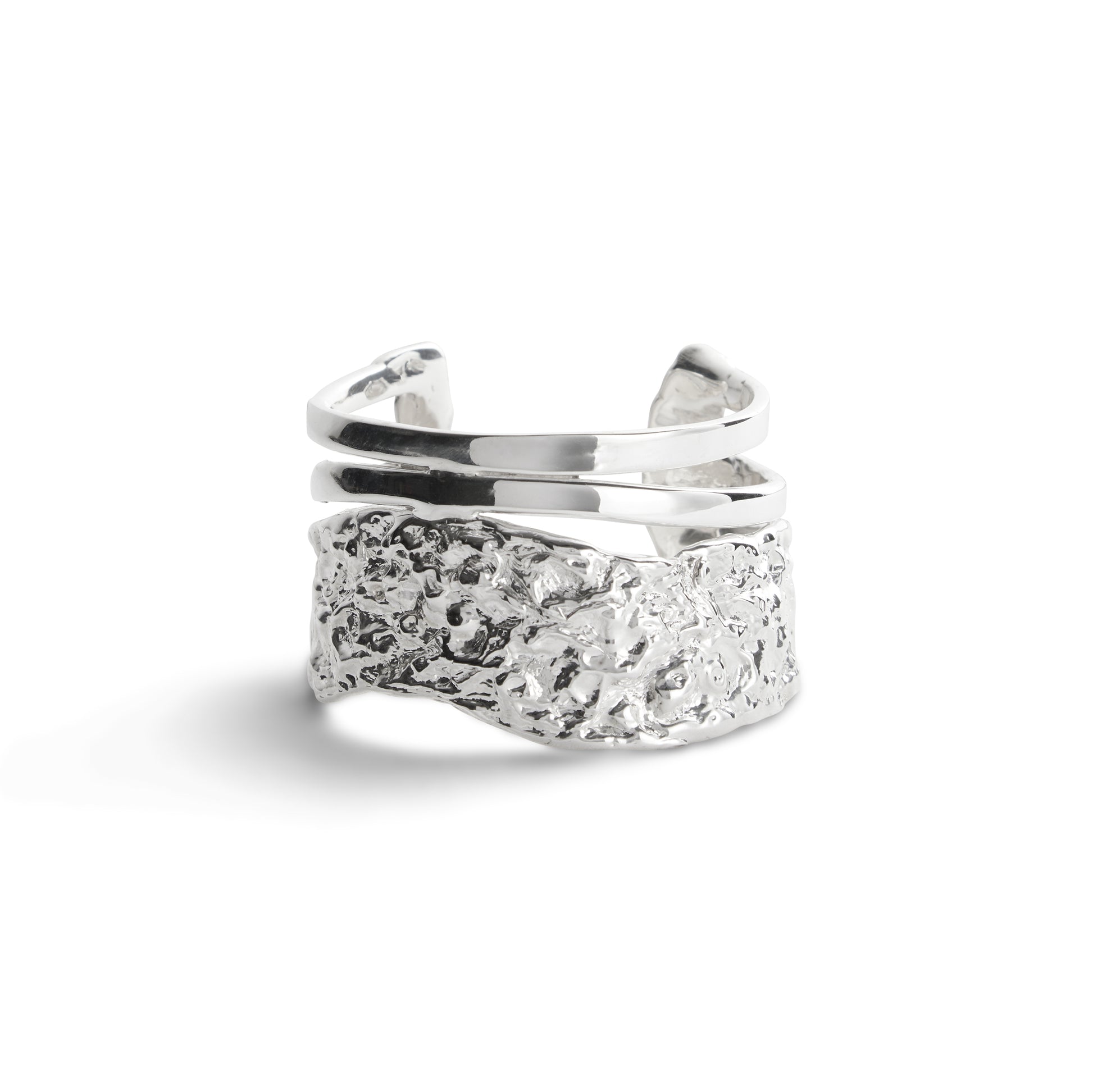 Hand-carved lost wax sterling silver cuff with a mix of textures and a loose, organic shape. A bold yet classic statement.