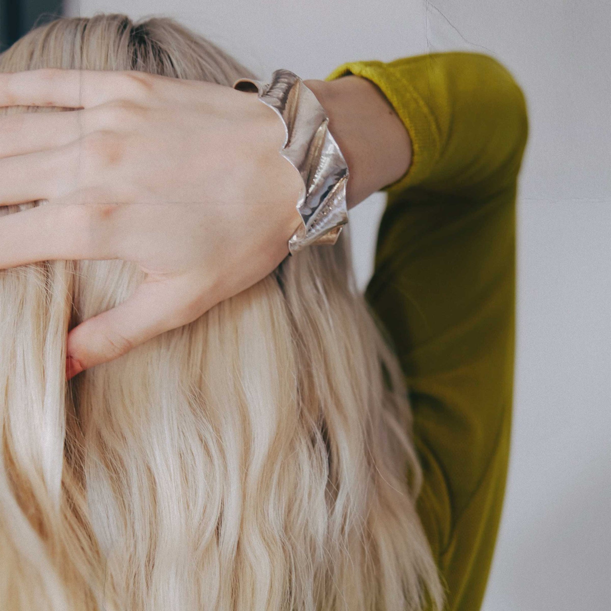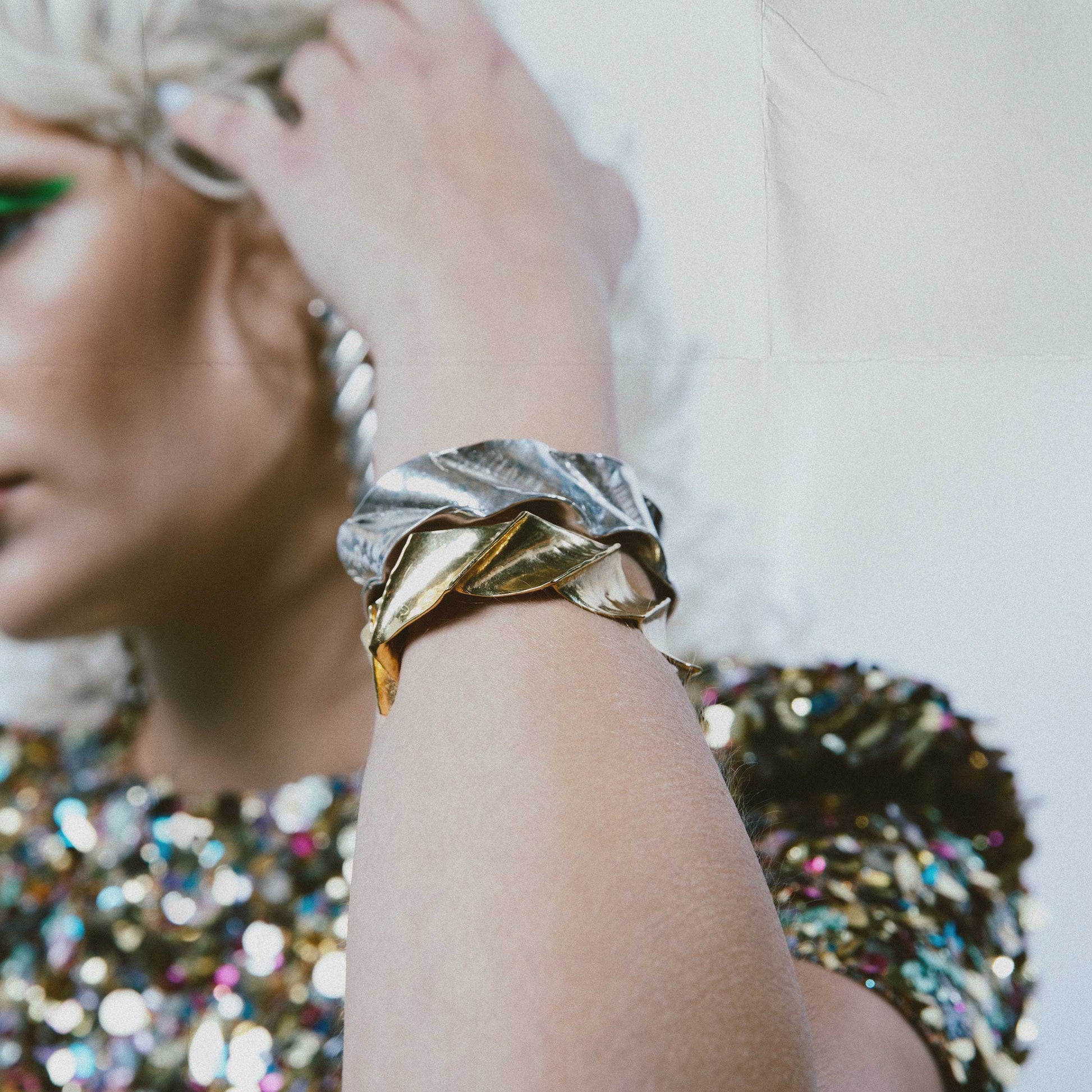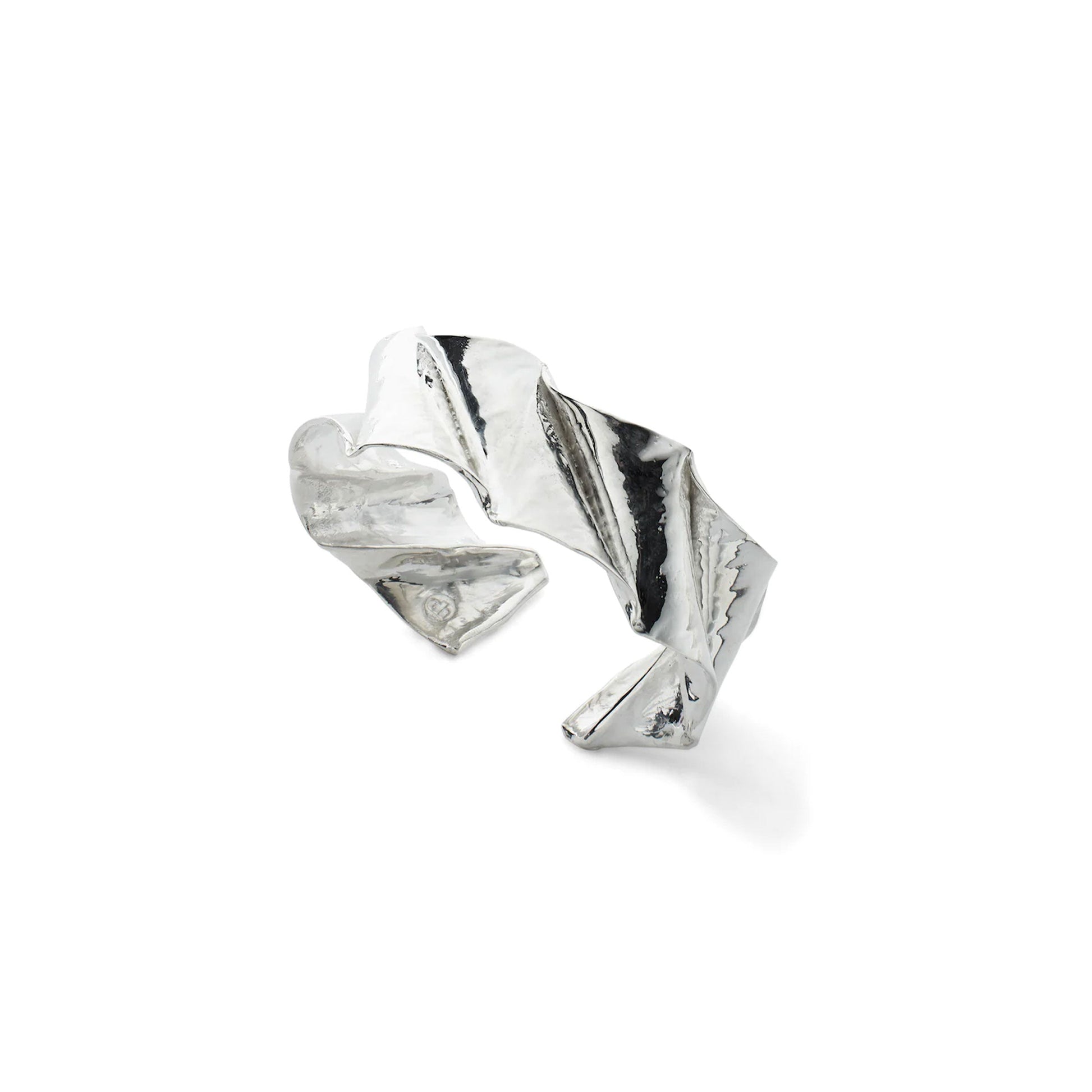 This statement bracelet is made of sterling silver and uses fold form technique. Can be worn alone or layered for a bold look.