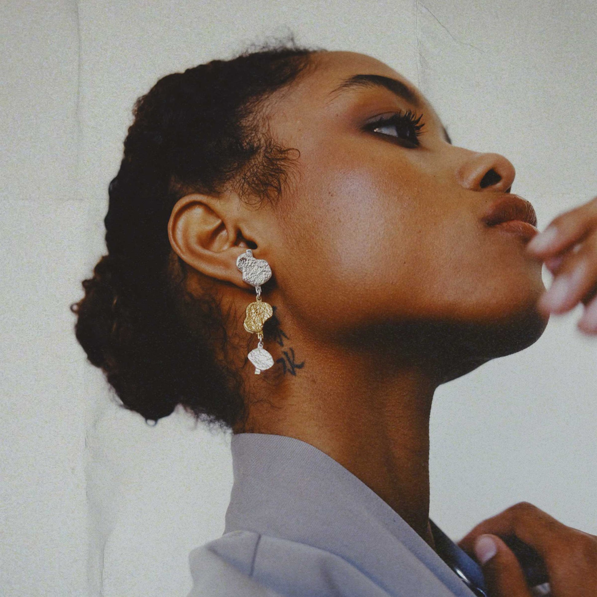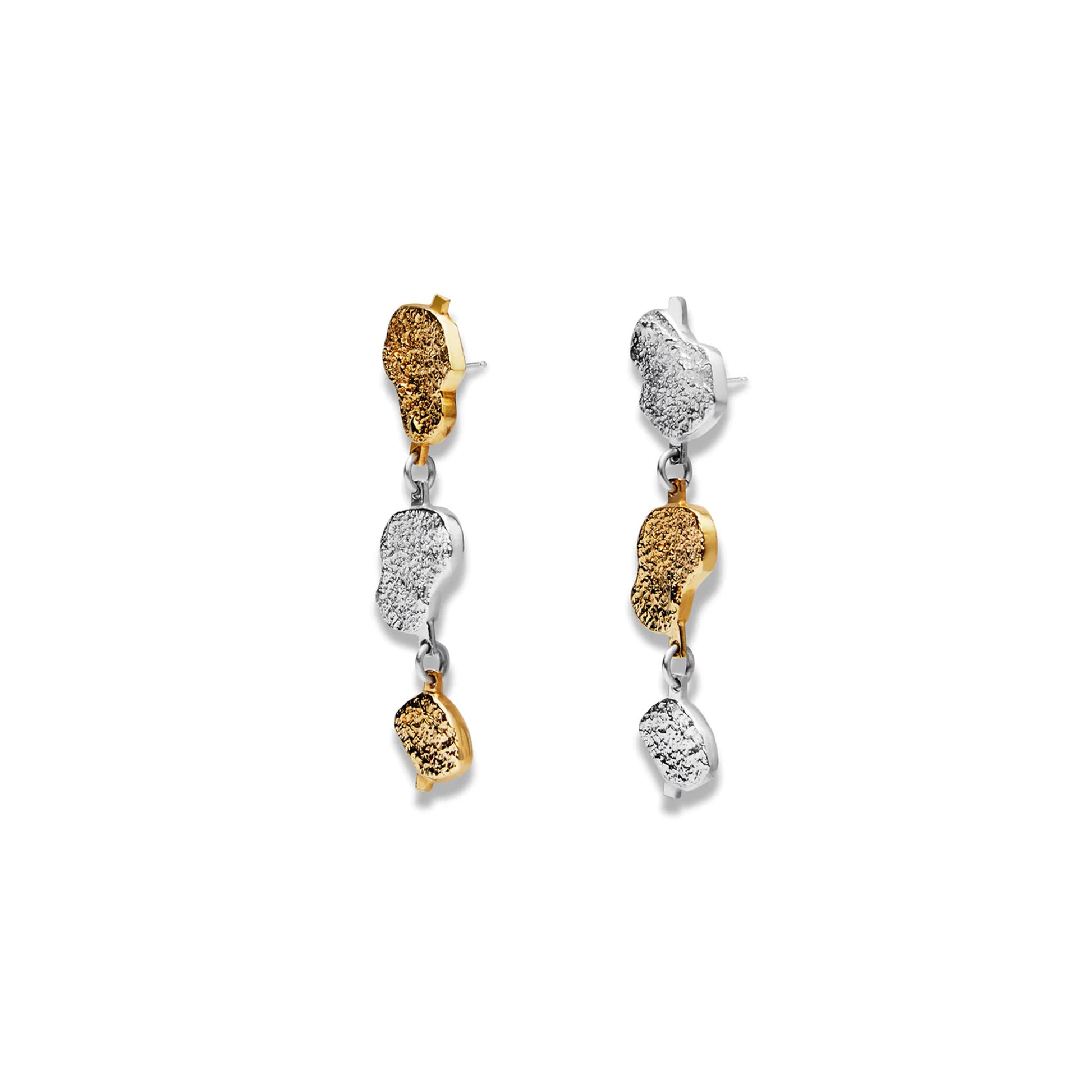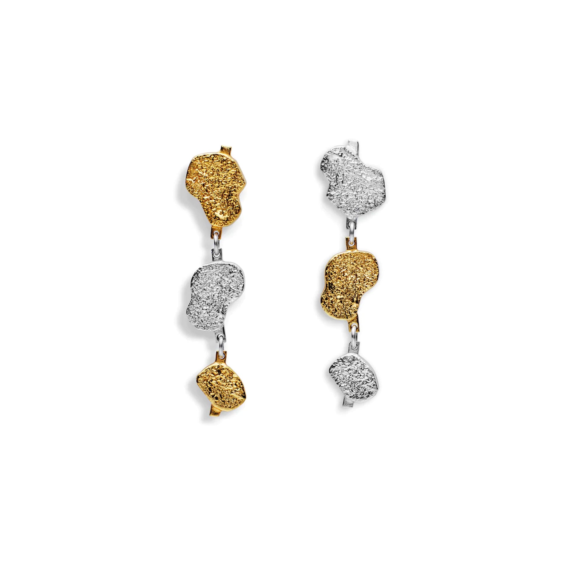 These mixed metal sterling and 14K vermeil earrings are inspired by Brutalist architecture showcasing organic shapes and raw texture.