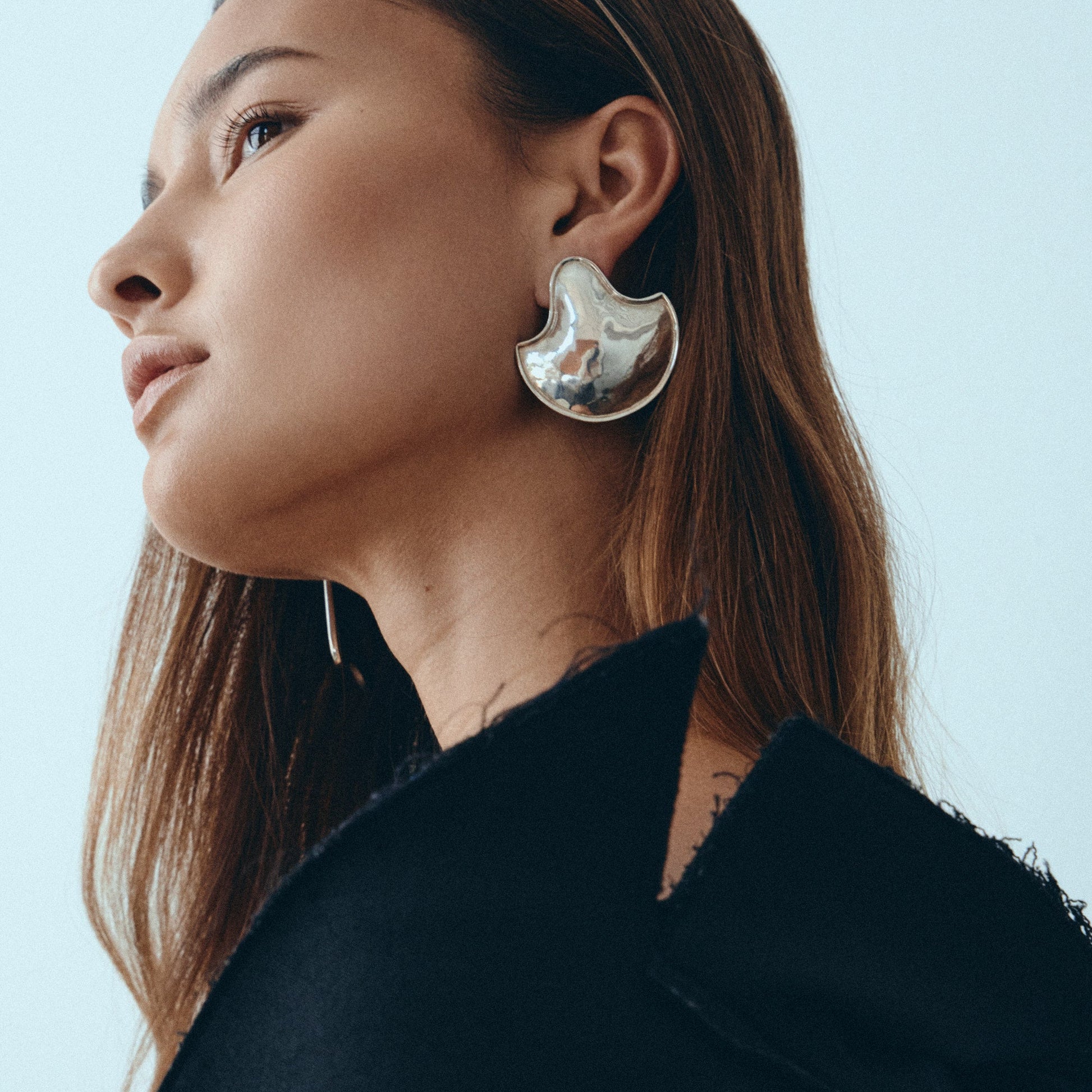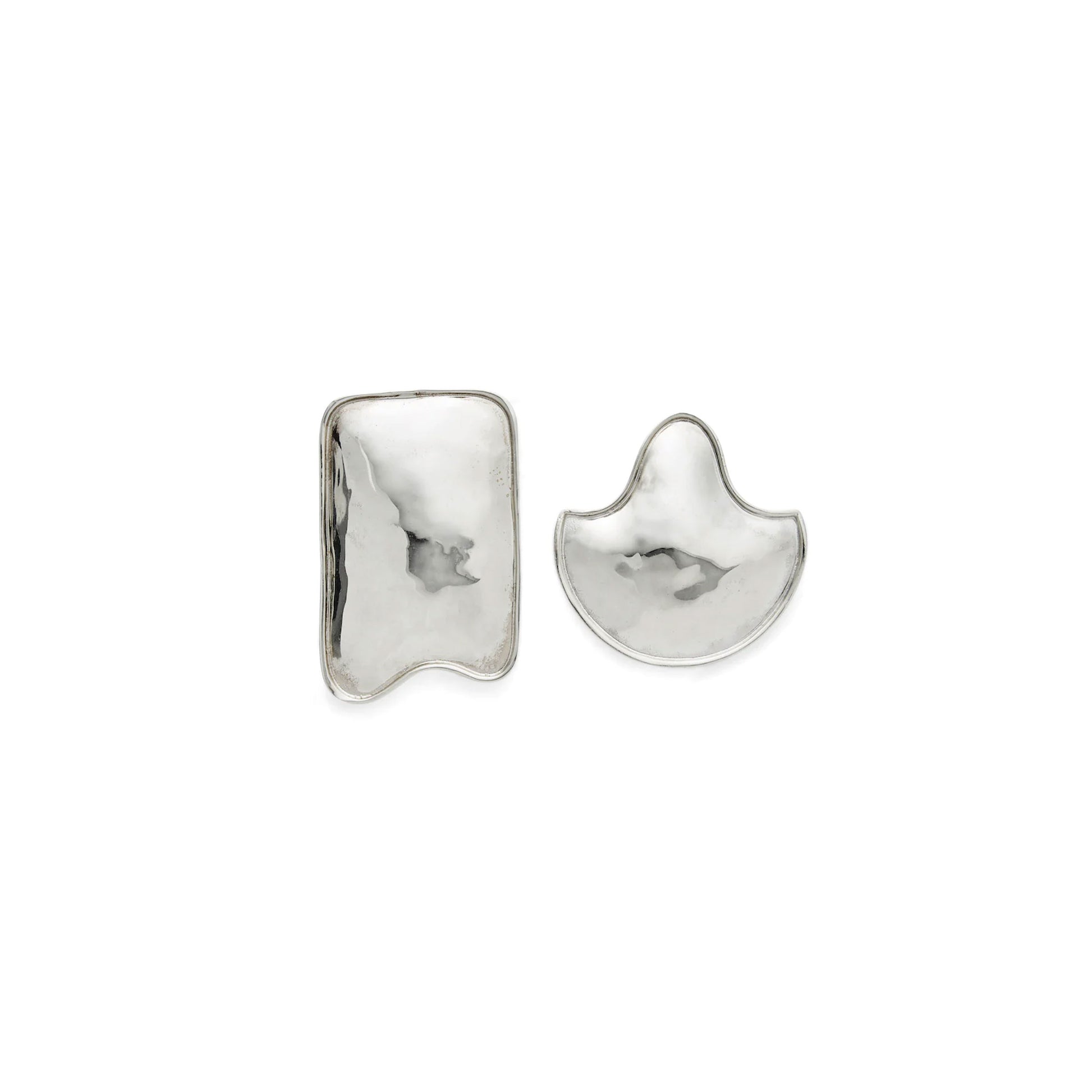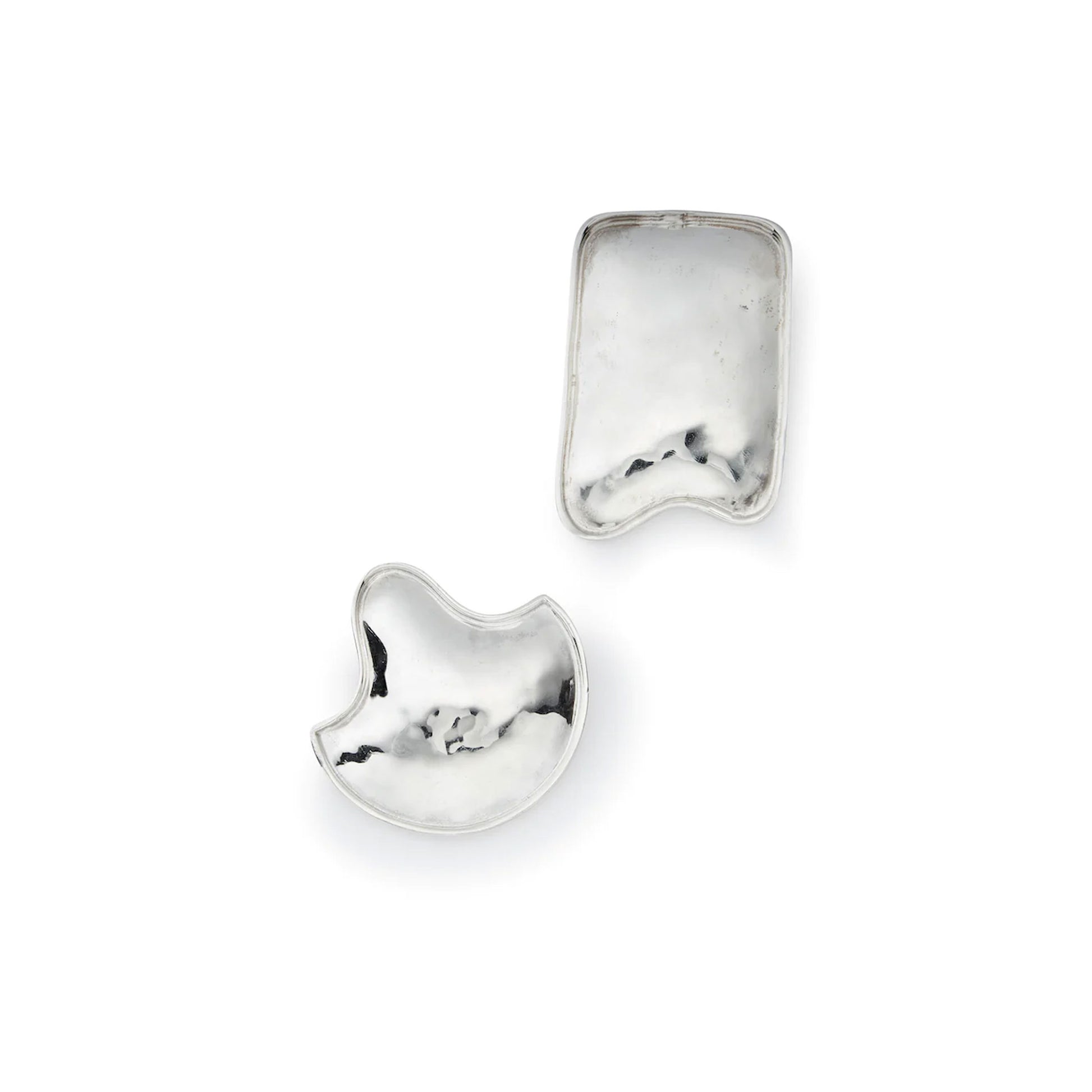 Sterling silver mismatched earrings that are lightly hammered and have a dome shape - they are sculptural and a best seller.