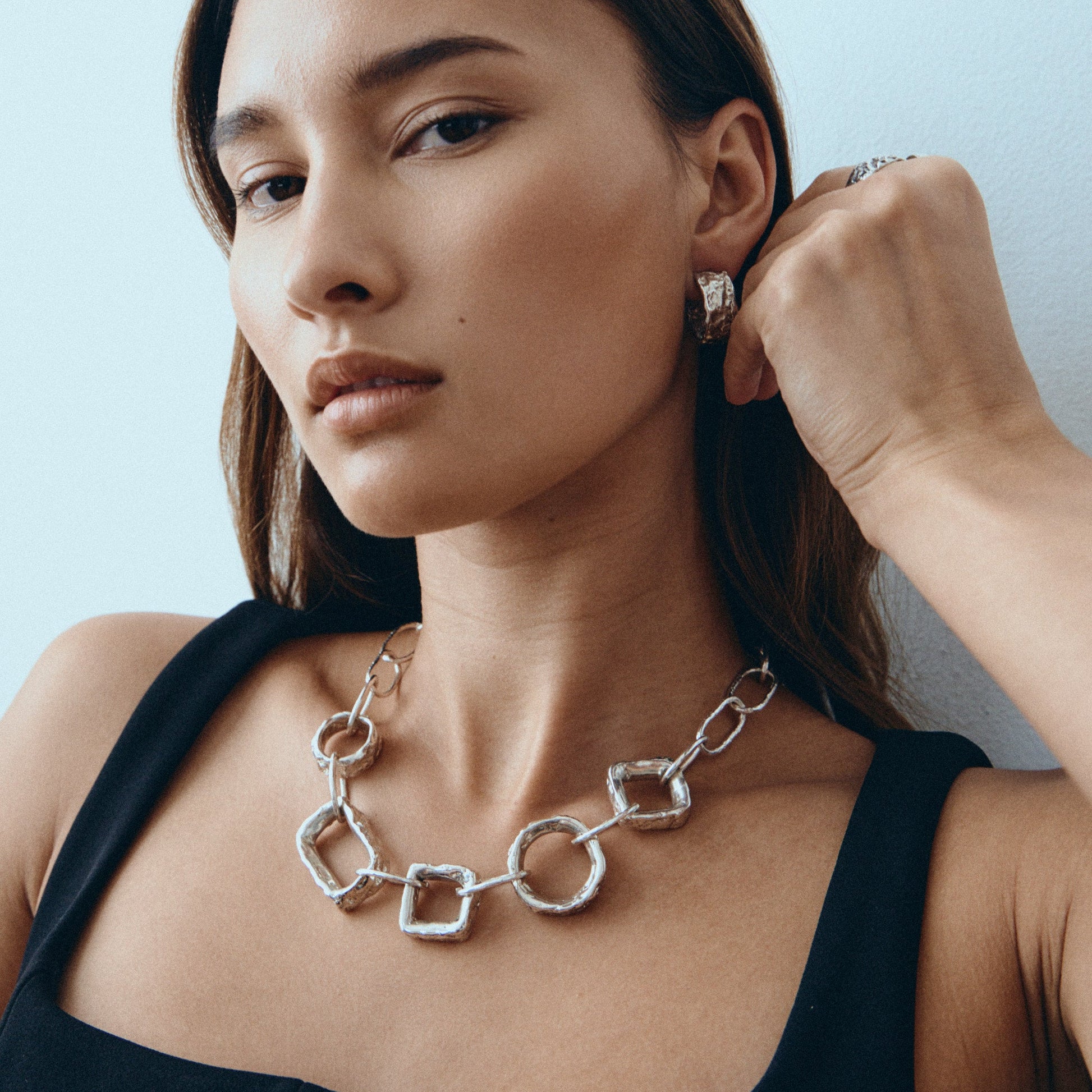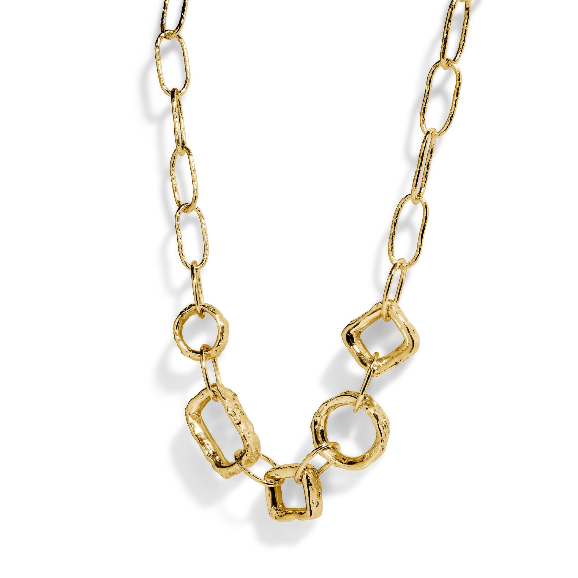 Bold, chunky necklace made with lost wax casting links geometric shapes for an edgy and elegant statement. 20.5 inches long.