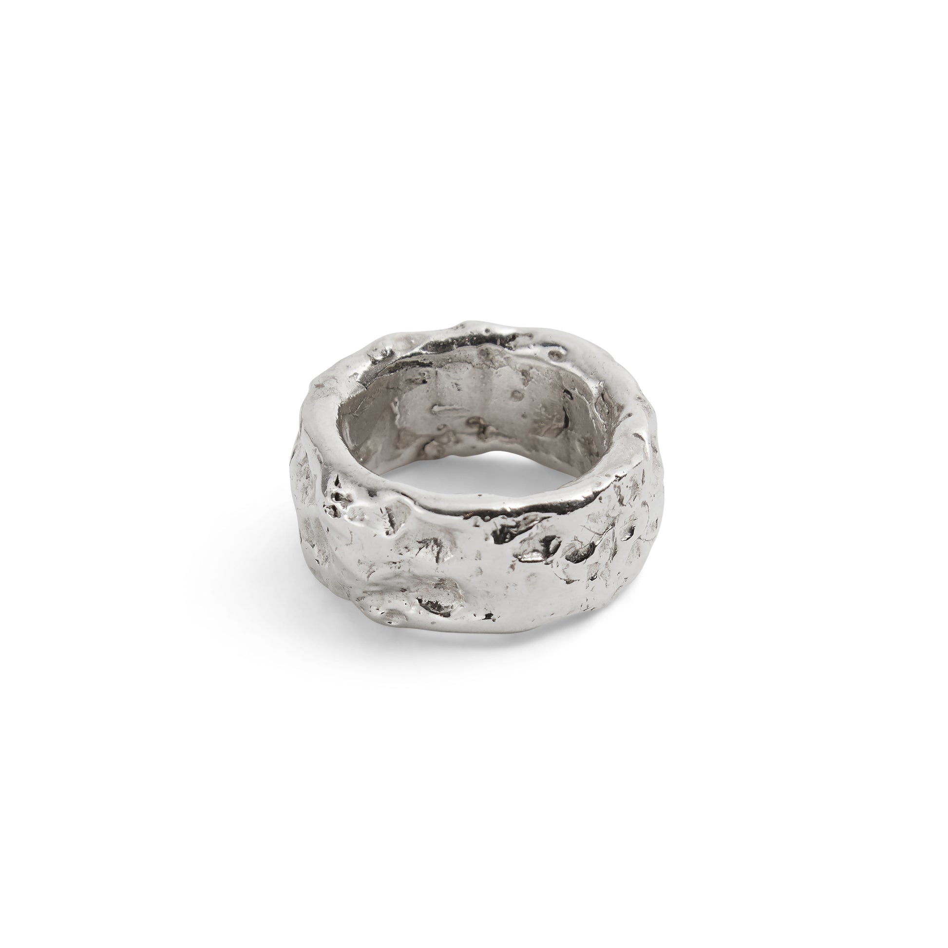 Sterling silver ring made using lost wax casting features a rough, organic texture and shape. Can be worn alone or stacked for a bolder look. Available to ship in size 6.5.