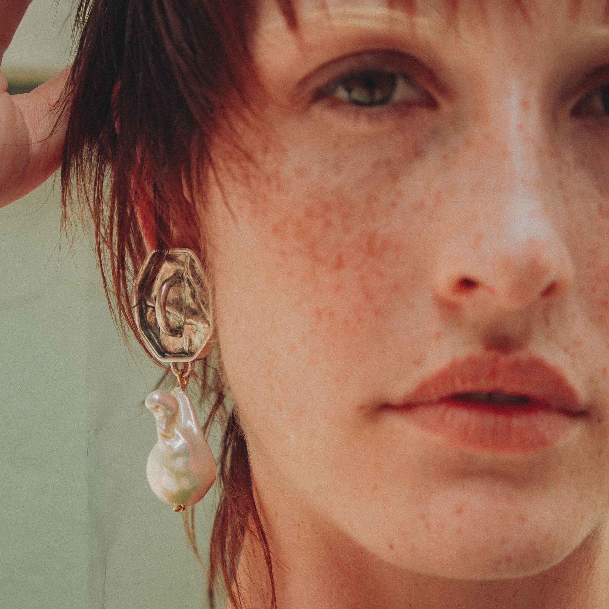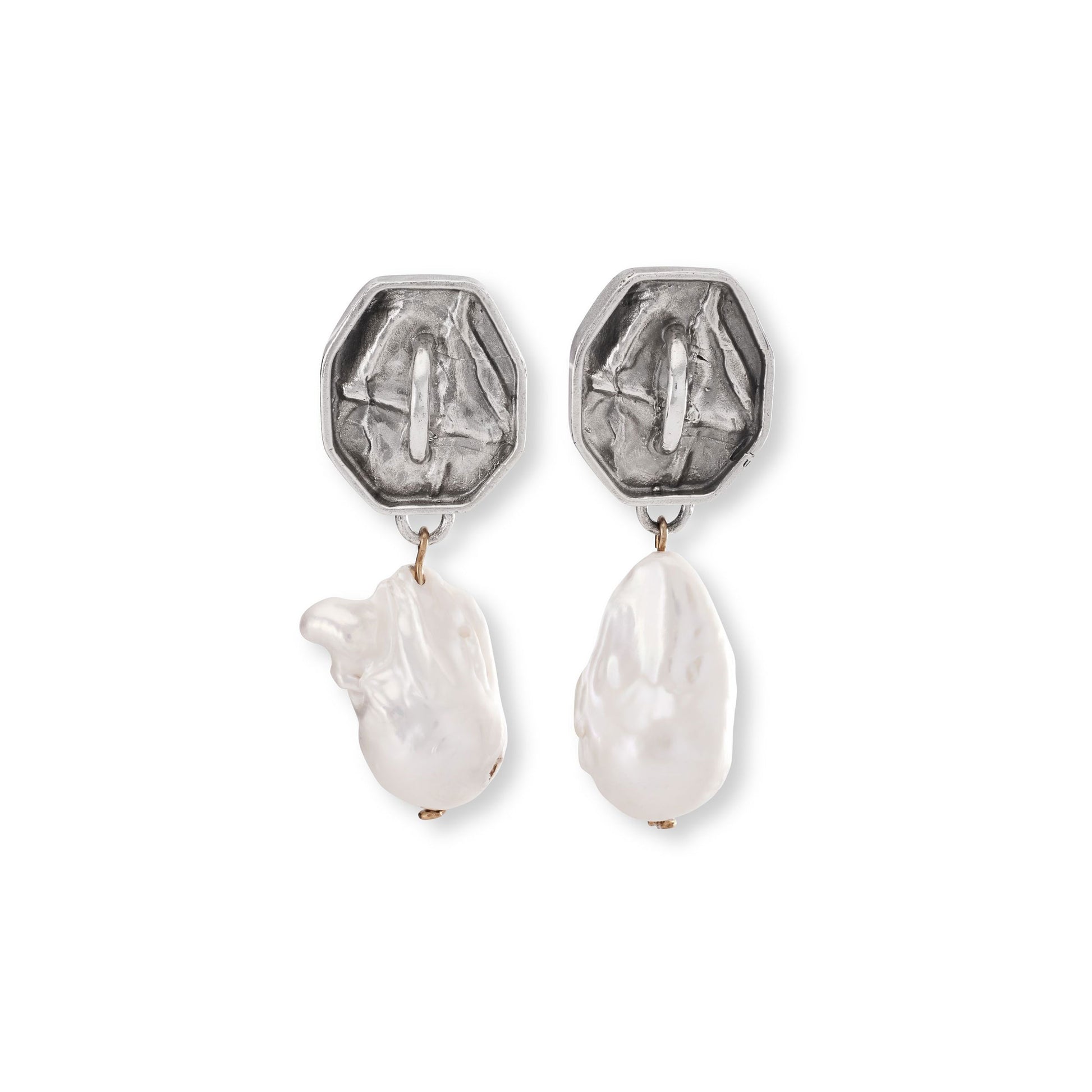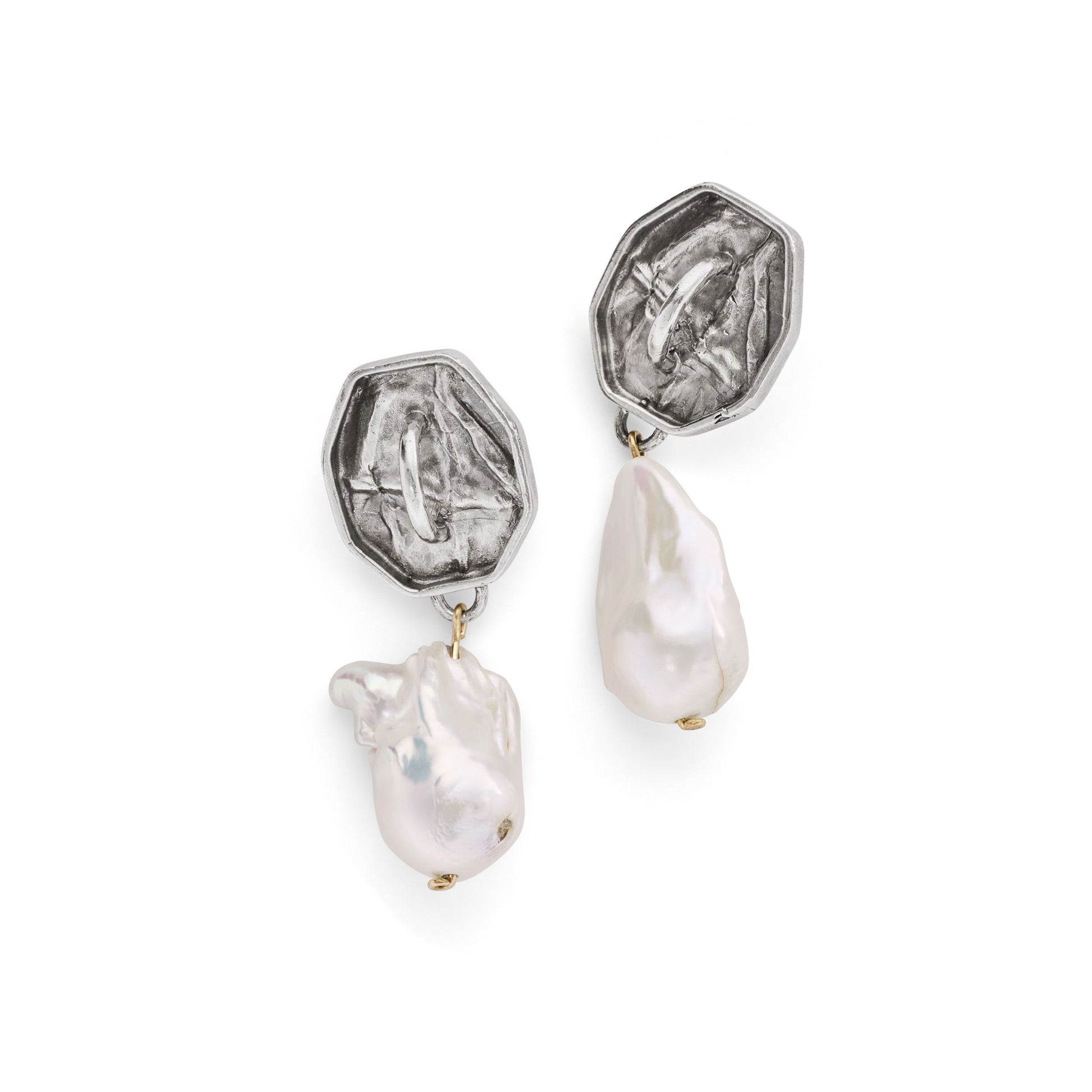 Handmade Sterling Silver with patina fold form with link detail and baroque pearls
